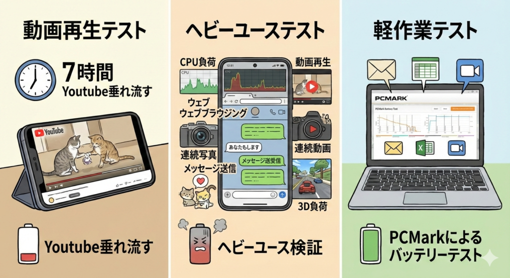 ・ヘビーユース:CPU高負荷、メディア再生、ブラウジング、連続写真撮影、連続動画撮影、メッセージ、GPU高負荷