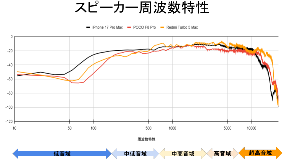 スピーカーの周波数特性も測定しました。測定データでも、iPhoneを上回る中音域の厚みが確認でき、音楽やトーク動画の声も非常に聞き取りやすい特性です。